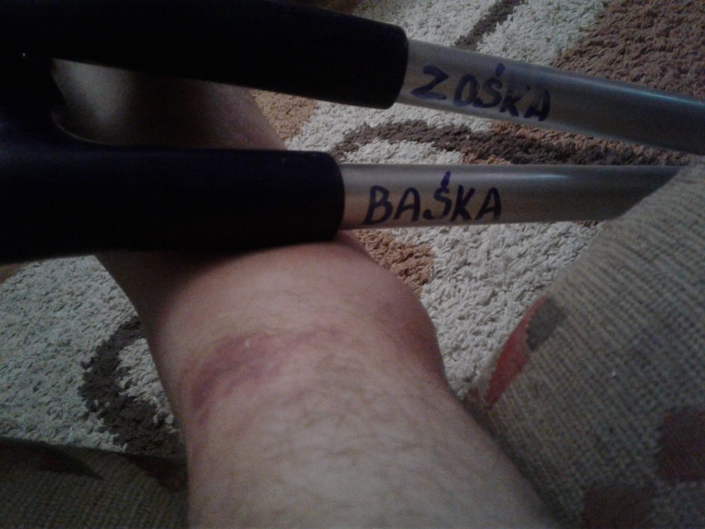 Jak to w moim życiu bywa – miałem farta, inni jak zwykle muszą się napracować. Poległem na spękanej latami jezdni jak pęknięty łańcuch wyrzucony z piły spalinowej. Przeszło mi przez myśl, że jeszcze wszystkich nie pożegnałem. Jednak po chwili wstałem o własnych siłach z masy bitumicznej, otrzepałem się i pomaszerowałem dalej czyniąc dalsze porządki w miejscu naszego montażu. I tak zrobiłem jeszcze z 10 kursów 30m do bloku i czwarte piętro (przypominam z narzędziami). Poprowadziłem pojazd na ul. Powstańców wielkopolskich oraz biorąc udział w pomiarze do szafy w bólach wróciłem do pojazdu plując i narzekając na lewo i prawo, gdyż dopiero po pewnym czasie narastająca opuchlizna generowała problemy w komunikacji pieszej. Po opuszczeniu Ciechanowa zaobserwowałem iż duży dyskomfort sprawia również dociskanie gazu i hamulca w prowadzonym pojeździe. Strzegowo już było męczarnią a tym bardziej przesiadka z busa do mojej vektry. Mój pojazd prawie ulżył mi w cierpieniach póki nie musiałem otworzyć bramy bez którą trza było wjechać na podwórze. To były bardzo długie i bolesne wędrówki. Z samochodu do bramy, z bramy do samochodu, z samochodu do bramy i w końcu do o domu.
